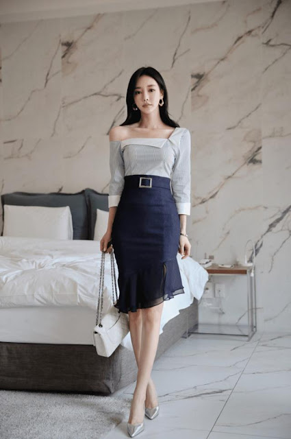 しかし、小澤は色の选択过程を検讨する価値があると考えています。まず襟と袖口の白で、質感の強いラインに助けられて、白が強く表現されています。すべてを蔑視する感じがあります。上着の細い紋様の設定は色に対するもう一つの表現で、下の墨青との移行になります。全体的に白と青の二つの色の差が大きいので、この方式を使うともっと楽に見えます。バッグとハイヒールはチームメイトから離れていません。全体の配色はデザイナーの一貫した水準を維持しています。片肩の折り返しスカート、銀色の細いハイヒール、陽剛のシックな感じがあなたを目視します。